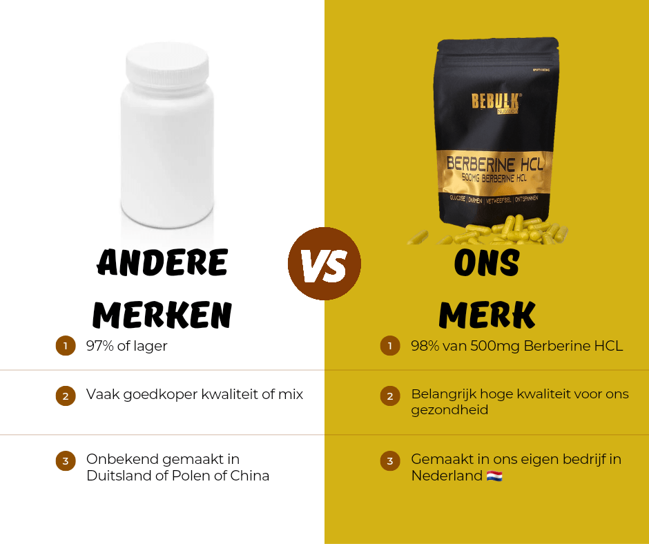 Berberine HCL 98% – 500 mg – Vegan – BeBulk Nutrition is een hoogwaardig voedingssupplement, geproduceerd in onze eigen Nederlandse faciliteit volgens HACCP-kwaliteitsnormen. Elke capsule bevat 500 mg zuivere Berberine HCL (gestandaardiseerd op 98%) in een plantaardige capsule.
